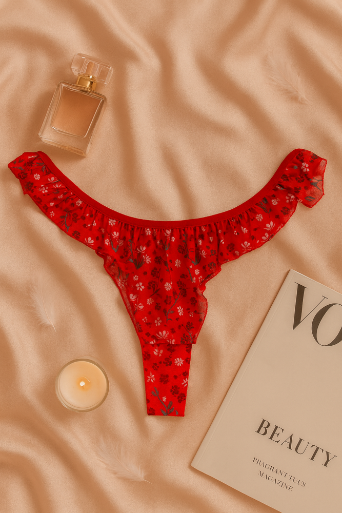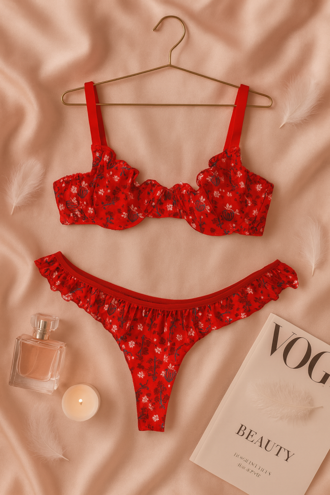 Cesur ve zarif görünümü bir araya getiren bu kırmızı çiçek desenli fırfırlı sütyen ve tanga takımı, kadınsı enerjiyi en şık haliyle yansıtıyor. Hafif transparan kumaşıyla teninizde zarif bir dokunuş hissi yaratırken, fırfır detayları romantik bir görünüm kazandırır. Kırmızının tutkusunu, çiçek desenlerinin zarafetiyle buluşturan bu özel takım; hem özel anlarda hem de günlük şıklığınızda size özgüveniyle eşlik eder.