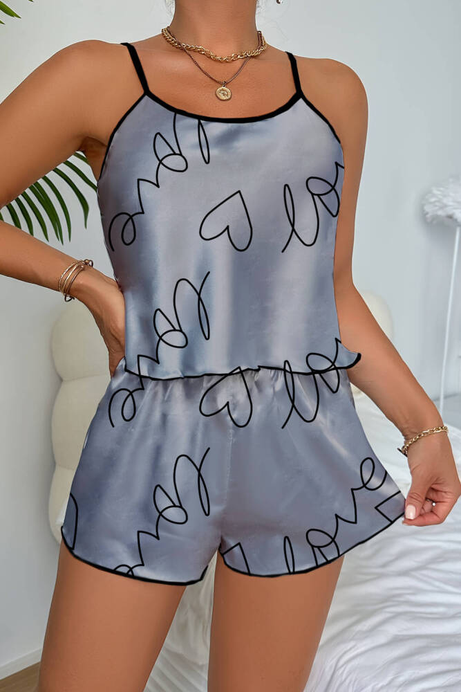 Love Baskılı Gri Saten Şortlu Gecelik Takım