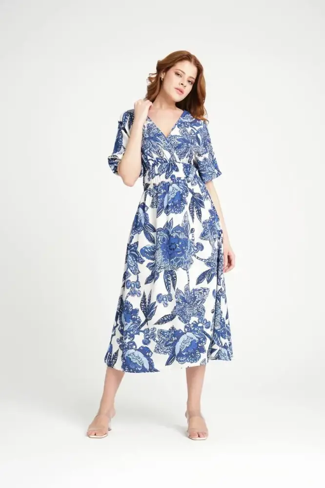 Bahar ve yaz aylarında stilinizi yansıtan şık bir seçenek: Mavi Çiçek Desenli V Yaka Elbise. Hafif kumaşı ve zarif çiçek desenleri ile hem rahat hem de şık bir görünüm sunar. V yaka ve kısa kollu tasarımıyla hem sıcak havalarda konforlu kullanım sağlar hem de şıklığınızı ön plana çıkarır. Bel kısmındaki elastik lastik, vücudu nazikçe sararak vücut hatlarınızı ortaya çıkarır. Şeffaf sandaletler veya sade takılarla mükemmel bir uyum sağlar.