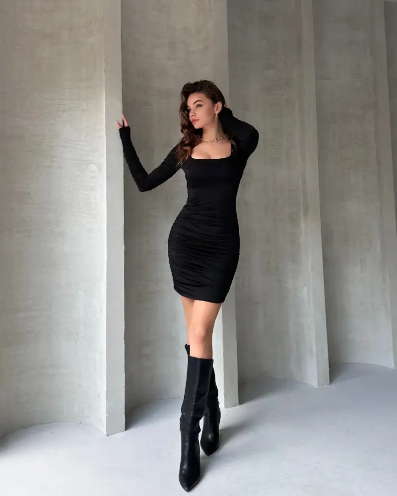 Feminen ve modern tasarımıyla dikkat çeken siyah açık yaka mini elbise, vücut hatlarını kusursuz bir şekilde ortaya çıkaran dar kesimiyle şıklığınızı ön plana çıkarır. Uzun kollu ve büzgü detaylı yapısıyla hem özel davetlerde hem de gece kombinlerinde stilinize sofistike bir dokunuş katar. Siyahın asil duruşuyla dolabınızın en iddialı parçalarından biri olacak.