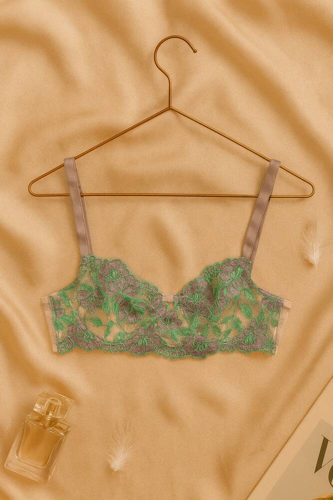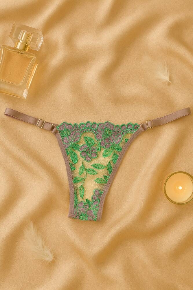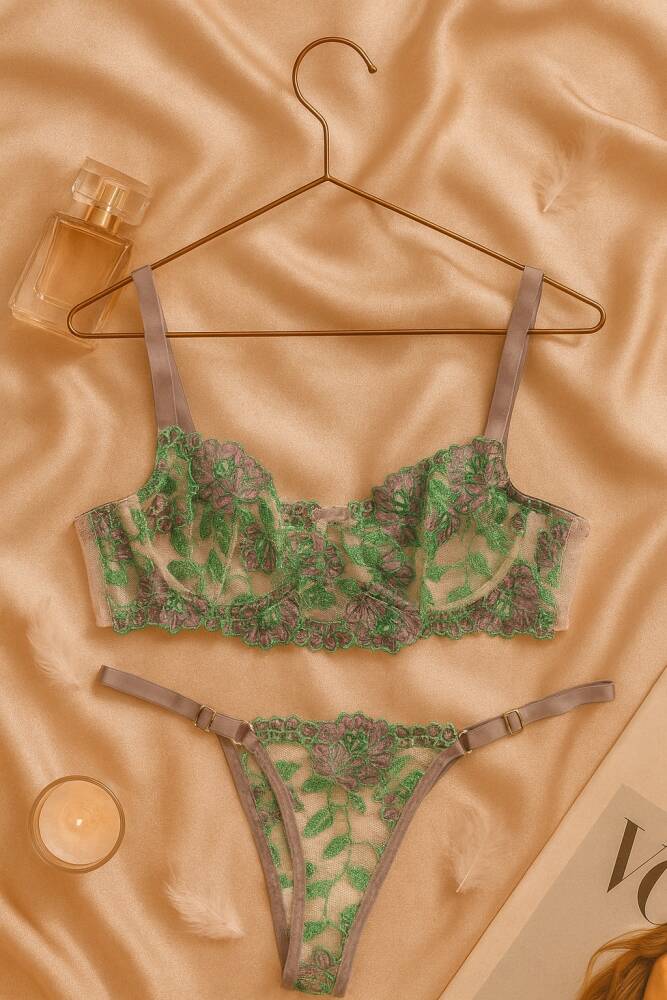 Doğanın zarafetinden ilham alan bu yeşil işlemeli dantelli sütyen ve tanga takımı, feminen şıklığın en büyüleyici halini sunuyor. Şeffaf dokusu, ince işlenmiş çiçek detayları ve saten tonlu askılarıyla hem zarif hem de modern bir görünüm yaratır. Vücuda mükemmel oturan esnek yapısı sayesinde konforlu bir kullanım sunarken, yeşil tonların doğallığıyla iç giyim koleksiyonunuza sofistike bir hava katar.